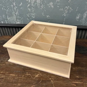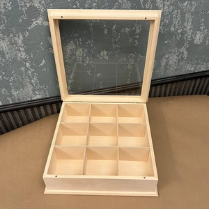 Конструкция: Короб с 9 внутренними отделениями и прозрачной стеклянной крышкой.