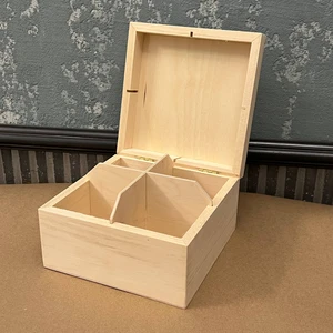 Уютная шкатулка из натуральной липы и березовой фанеры с четырьмя аккуратными отделениями. Идеальный формат для хранения чайных пакетиков, образцов чая, украшений, косметики или творческих материалов. Древесина отлично подходит для декорирования в любой технике: декупаж, роспись, выжигание, покрытие морилкой.